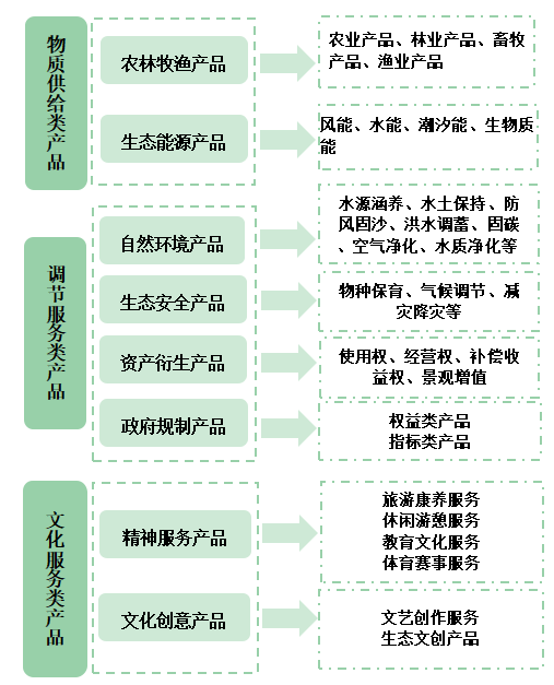 物質(zhì)供給類產(chǎn)品是指生態(tài)系統(tǒng)為人類提供的各種有形的物質(zhì)產(chǎn)品,還可分為直接利用供給生態(tài)產(chǎn)品(農(nóng)林牧漁產(chǎn)品)和轉(zhuǎn)化利用供給生態(tài)產(chǎn)品(生態(tài)能源產(chǎn)品);調(diào)節(jié)服務(wù)類產(chǎn)品是指生態(tài)系統(tǒng)通過其自身的生態(tài)過程對環(huán)境起到調(diào)節(jié)作用而產(chǎn)生的無形產(chǎn)品,包括自然生態(tài)服務(wù)產(chǎn)品、生態(tài)安全產(chǎn)品、資產(chǎn)衍生產(chǎn)品和政府規(guī)制產(chǎn)品。其中,自然生態(tài)服務(wù)產(chǎn)品主要包括水源涵養(yǎng)、水土保持、防風(fēng)固沙、海岸線防護(hù)、洪水調(diào)蓄、固碳、空氣凈化、水質(zhì)凈化等;生態(tài)安全產(chǎn)品包括物種保育、氣候調(diào)節(jié)、減災(zāi)降災(zāi)等;資產(chǎn)衍生產(chǎn)品是由生態(tài)資源要素所有權(quán)衍生出的、具有明確產(chǎn)權(quán)的生態(tài)產(chǎn)品,政府規(guī)制產(chǎn)品是通過政府管控手段創(chuàng)造特定交易需求而形成的權(quán)益或指標(biāo)類生態(tài)產(chǎn)品,其中權(quán)益類產(chǎn)品主要包括碳排放配額、碳普惠、碳匯產(chǎn)品、排污權(quán)、用能權(quán)、取水權(quán)等,指標(biāo)類產(chǎn)品包括綠化增量責(zé)任指標(biāo)、森林覆蓋率考核指標(biāo)、森林單位蓄積增量指標(biāo)、清水增量責(zé)任指標(biāo)、海岸線占補平衡指標(biāo)、生態(tài)積分、水質(zhì)信用、地票等。文化服務(wù)類產(chǎn)品指生態(tài)系統(tǒng)為人類提供的具有文化、精神和娛樂價值的產(chǎn)品和服務(wù),主要包括精神服務(wù)產(chǎn)品和文化創(chuàng)意產(chǎn)品,其中,精神服務(wù)產(chǎn)品包括旅游康養(yǎng)、休閑游憩、教育文化、體育賽事等,文化創(chuàng)意產(chǎn)品包括文藝創(chuàng)作服務(wù)和生態(tài)文創(chuàng)產(chǎn)品等。
