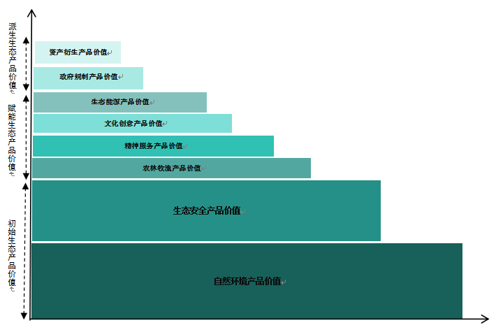 通過分析,本文認(rèn)為生態(tài)產(chǎn)品價值可以理解為初始生態(tài)產(chǎn)品價值、賦能生態(tài)產(chǎn)品價值、派生生態(tài)產(chǎn)品價值,且生態(tài)產(chǎn)品價值的構(gòu)成比例呈現(xiàn)階梯型分布特征(圖3)。初始生態(tài)產(chǎn)品價值是指生態(tài)系統(tǒng)最基礎(chǔ)、最核心的價值,是其他所有價值衍生的源頭,主要包括生態(tài)安全產(chǎn)品價值、自然環(huán)境產(chǎn)品價值;賦能生態(tài)產(chǎn)品價值是指在初始生態(tài)產(chǎn)品價值基礎(chǔ)上,通過適度的人工勞動、技術(shù)投入、管理優(yōu)化或品牌建設(shè)等手段,對初始生態(tài)產(chǎn)品進(jìn)行品質(zhì)提升、功能拓展、效率提高,將其轉(zhuǎn)化為可直接滿足人類物質(zhì)和精神需求的、更具市場交易屬性的產(chǎn)品或服務(wù),主要包括農(nóng)林牧漁產(chǎn)品價值、精神服務(wù)產(chǎn)品價值、文化創(chuàng)意產(chǎn)品價值、生態(tài)能源產(chǎn)品價值等;派生生態(tài)產(chǎn)品價值是指在初始產(chǎn)品和賦能產(chǎn)品價值的基礎(chǔ)上,通過制度設(shè)計、金融創(chuàng)新以及市場機制所衍生的,代表生態(tài)價值產(chǎn)權(quán)或政策目標(biāo)的抽象化、金融化或規(guī)制性價值,主要包括資產(chǎn)衍生產(chǎn)品價值、政府規(guī)制產(chǎn)品價值等。