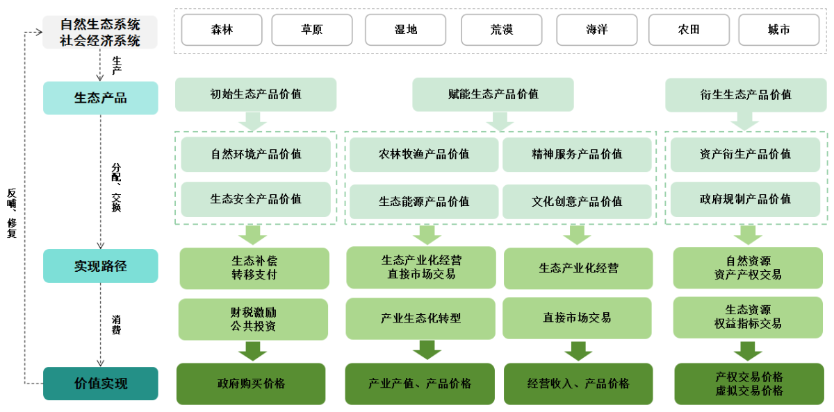 在生產(chǎn)環(huán)節(jié)中,生態(tài)產(chǎn)品的形成過程本質(zhì)上是生態(tài)生產(chǎn)和經(jīng)濟(jì)生產(chǎn)的有機融合過程,生態(tài)產(chǎn)品持續(xù)供給依賴于自然生態(tài)系統(tǒng)和社會經(jīng)濟(jì)系統(tǒng)的良性互動和協(xié)同演進(jìn)。自然生態(tài)系統(tǒng)是生產(chǎn)生態(tài)產(chǎn)品的物質(zhì)基礎(chǔ)和價值源泉,通過發(fā)揮物質(zhì)循環(huán)、能量流動和信息傳遞三大基本功能,創(chuàng)造了生態(tài)產(chǎn)品的“原始價值”或“本底價值”,這一過程即為生態(tài)生產(chǎn)過程;社會經(jīng)濟(jì)系統(tǒng)強調(diào)人類活動的重要作用,通過融入保護(hù)修復(fù)、技術(shù)創(chuàng)新、品牌賦能等人類勞動,盤活優(yōu)質(zhì)生態(tài)資源,將生態(tài)優(yōu)勢轉(zhuǎn)化為可直接進(jìn)入市場的產(chǎn)品或服務(wù),或者通過制度設(shè)計將抽象的生態(tài)價值或政策目標(biāo)轉(zhuǎn)化為可交易的權(quán)益或指標(biāo),這一過程即為經(jīng)濟(jì)生產(chǎn)過程。通過生態(tài)生產(chǎn)與經(jīng)濟(jì)生產(chǎn)將資源形態(tài)轉(zhuǎn)化為產(chǎn)品形態(tài),形成生態(tài)產(chǎn)品的初始生態(tài)產(chǎn)品價值、賦能生態(tài)產(chǎn)品價值、派生生態(tài)產(chǎn)品價值,完成生態(tài)產(chǎn)品的初級生產(chǎn)。