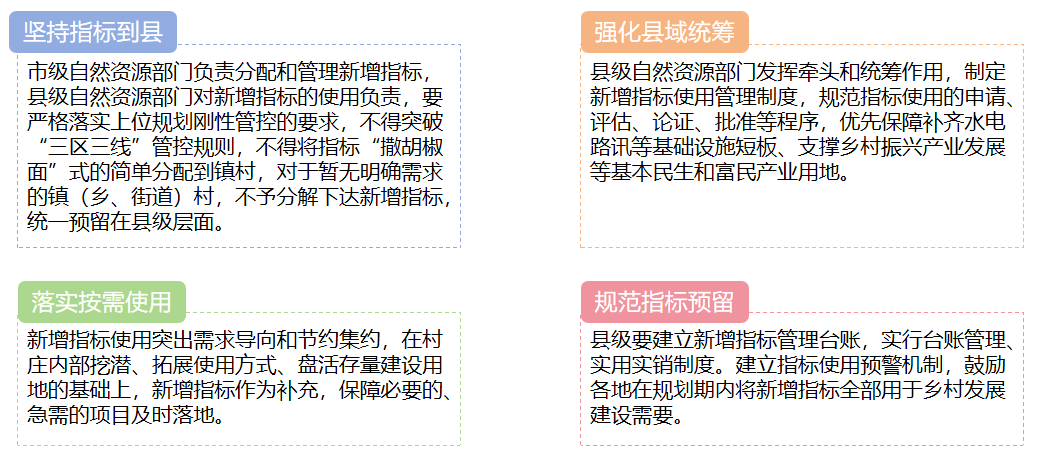 為切實加強國土空間規(guī)劃實施管理,嚴格實施國土空間用途管制,精準發(fā)揮新增農(nóng)村建設(shè)用地指標對鄉(xiāng)村振興支撐保障作用。陜西省自然資源廳于2024年12月下發(fā)了《關(guān)于規(guī)范國土空間規(guī)劃中新增農(nóng)村建設(shè)用地指標使用的指導意見》(試行),對新增農(nóng)村建設(shè)用地指標使用提出了指導意見: